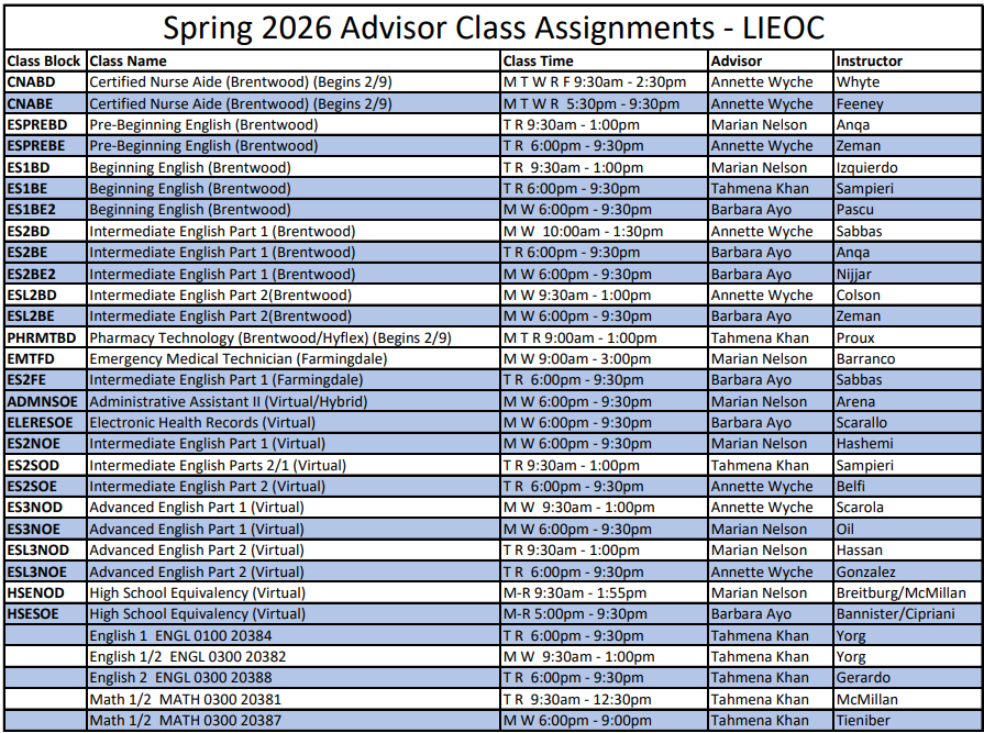 Counselor's Contact Information Counselor Class List for On-Site and Off-Site Locations For The Spring 2026 Semester. Counselor List coming soon! Off-Site Locations / Public Local Libraries On-Sites Locations / Brentwood and Farmingdale Annette Wyche wychea@farmingdale.edu Barbara Ayo ayoba@farmingdale.edu Marian Nelson nelsonm@farmingdale.edu Tahmena Khan khant1@farmingdale.edu